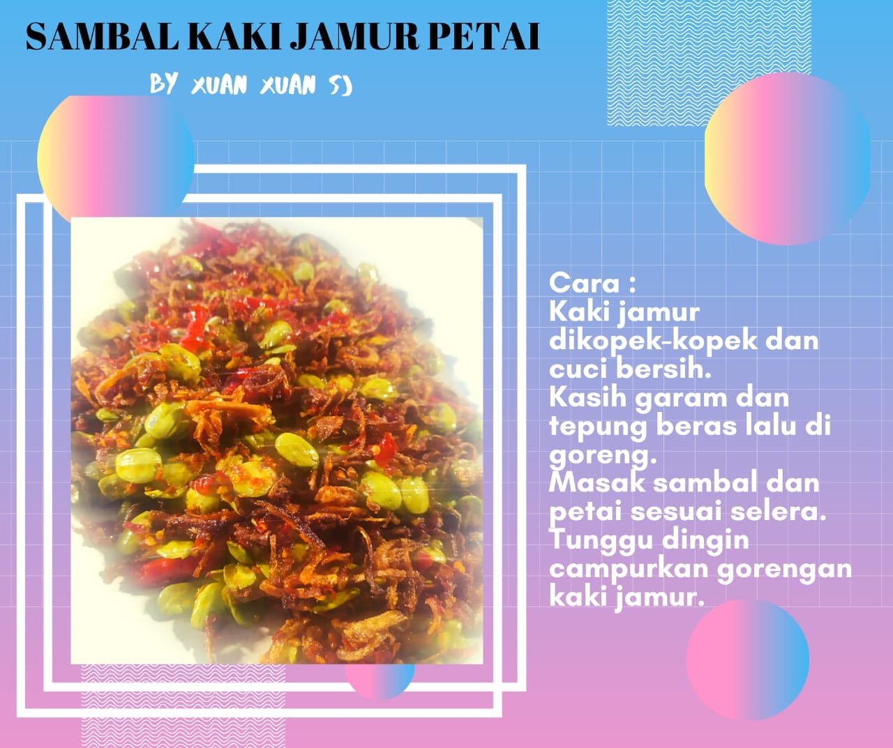 July 8, 2020 ZhenShanMei Pekanbaru SAMBAL KAKI JAMUR PETAI resep vegetarian Created by Xuan xuan Bagikan di: Share on Facebook (Opens in new window) Facebook Share on WhatsApp (Opens in new window) WhatsApp Related