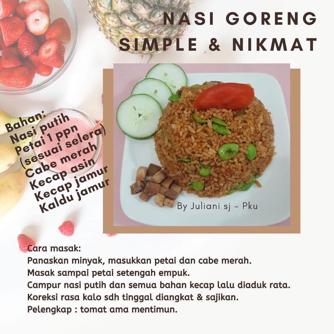 July 10, 2020 ZhenShanMei Pekanbaru NASI GORENG SIMPLE & NIKMAT resep vegetarian Created by Juliani Shijie, Edited by Restuti Shijie Bagikan di: Share on Facebook (Opens in new window) Facebook Share on WhatsApp (Opens in new window) WhatsApp Related