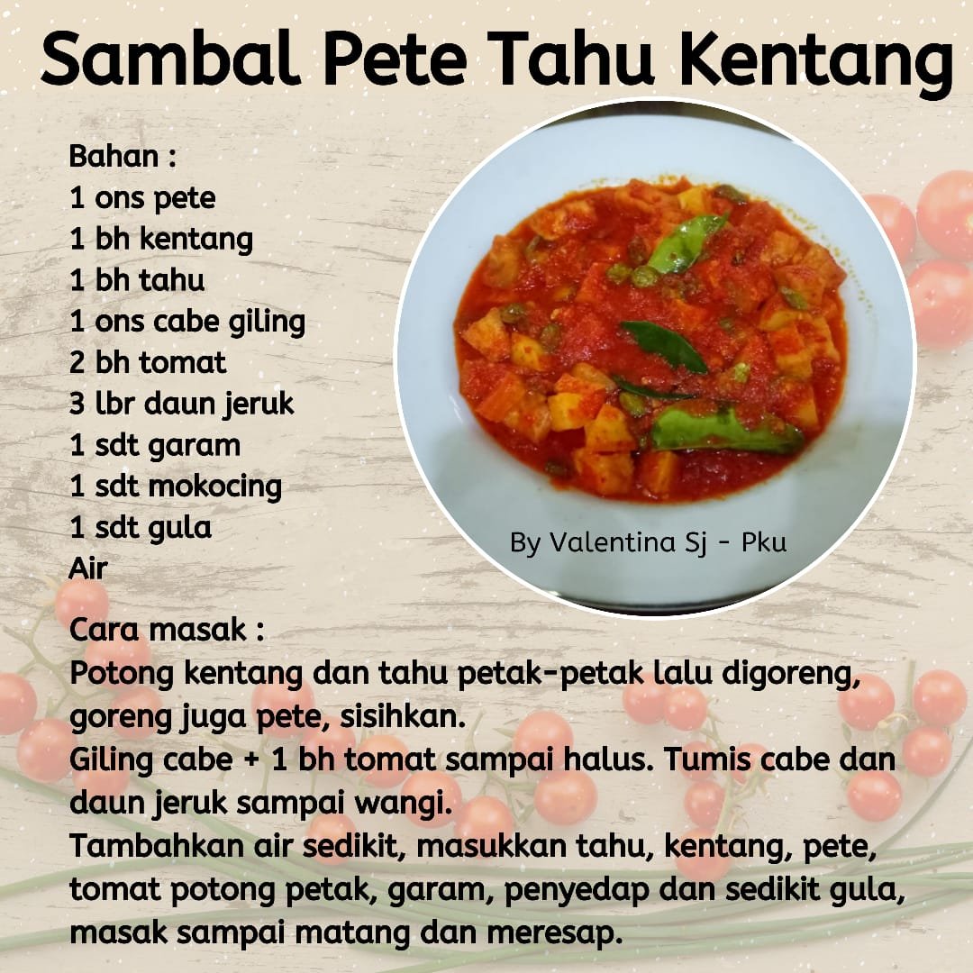 July 10, 2020 ZhenShanMei Pekanbaru SAMBAL PETE TAHU KENTANG resep vegetarian Created by Valentina Angela, Edited by Restuti Shijie Bagikan di: Share on Facebook (Opens in new window) Facebook Share on WhatsApp (Opens in new window) WhatsApp Related
