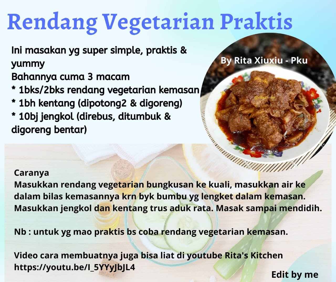 July 13, 2020 ZhenShanMei Pekanbaru RENDANG VEGETARIAN PRAKTIS resep vegetarian Created by Rita Xiuxiu, Edited by Restuti shijie Bagikan di: Share on Facebook (Opens in new window) Facebook Share on WhatsApp (Opens in new window) WhatsApp Related