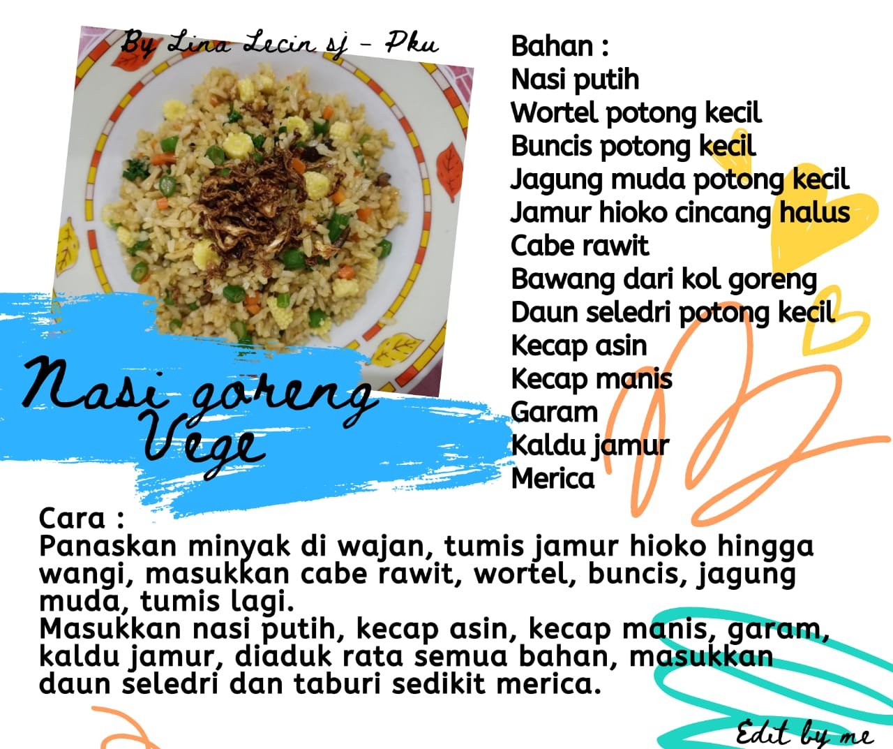 July 24, 2020July 27, 2020 ZhenShanMei Pekanbaru NASI GORENG VEGE resep vegetarian Created by Lina Lecin, Edited by Restuti Shijie Bahan utama: Nasi, Wortel, Buncis, jagung muda, jamur hioko, Bagikan di: Share on Facebook (Opens in new window) Facebook Share on WhatsApp (Opens in new window) WhatsApp Related
