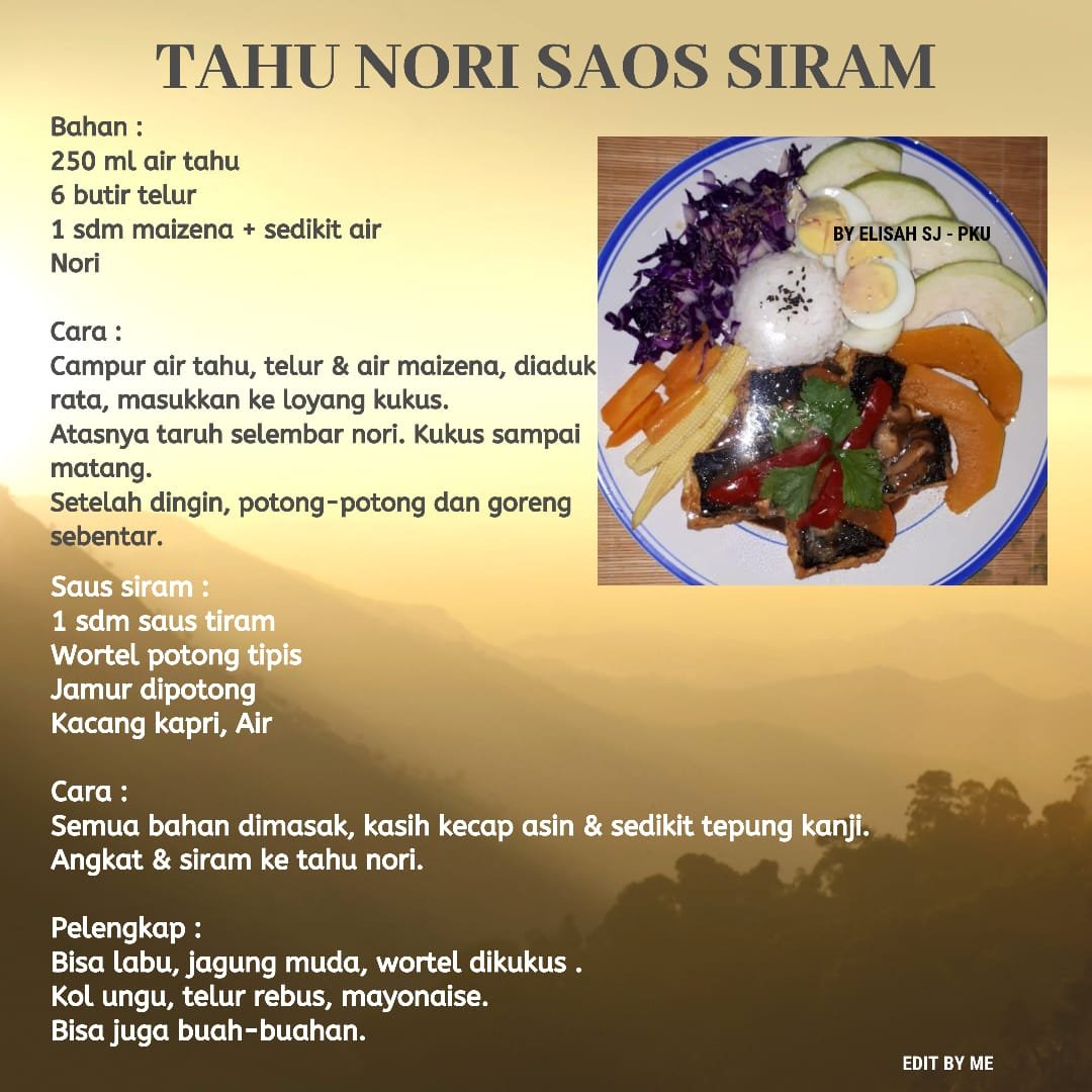 Bahan utama: telur/ telor, air tahu, labu, jagung muda, wortel, kol ungu, buahan