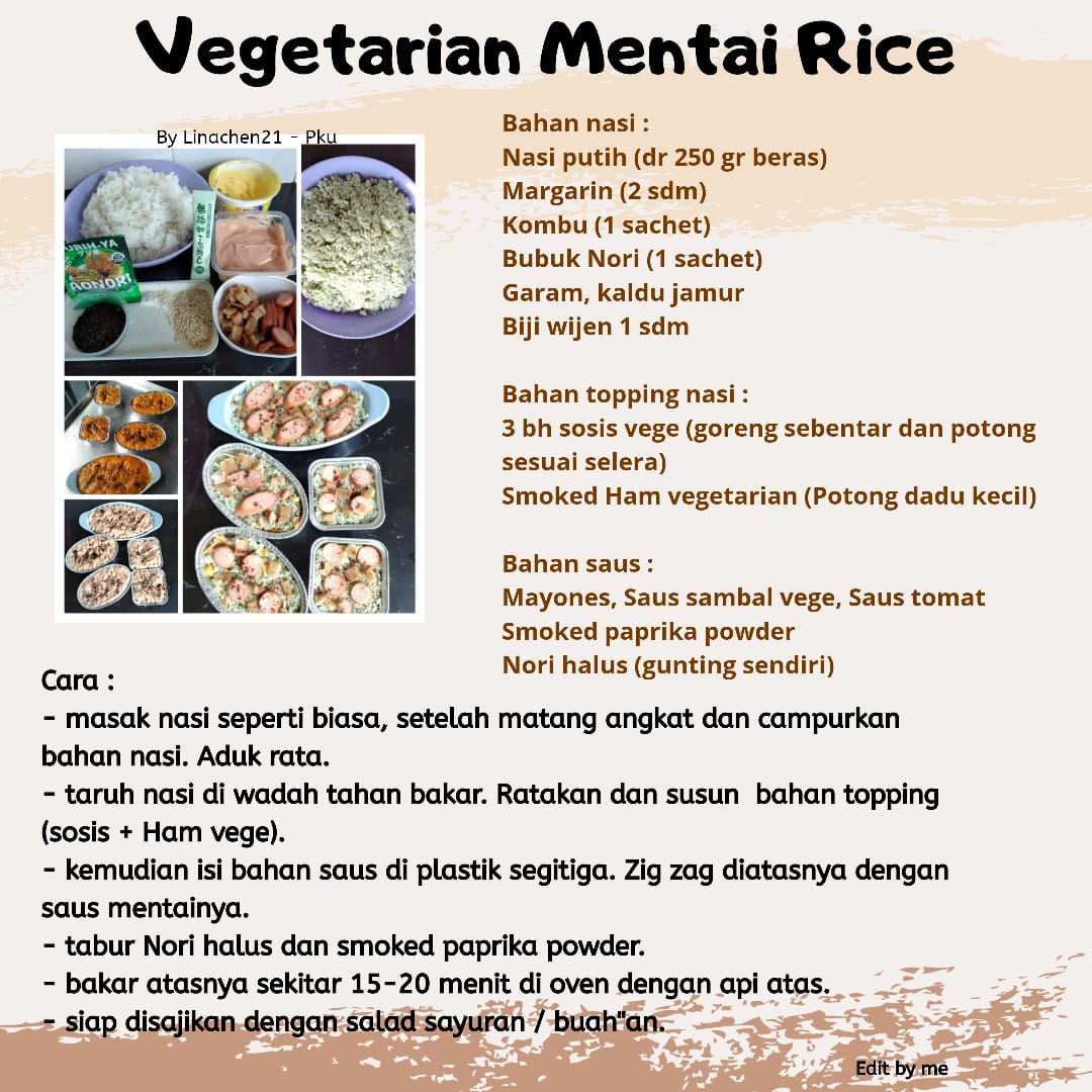 – taruh nasi di wadah tahan bakar. Ratakan dan susun bahan topping (sosis+ Ham vege).