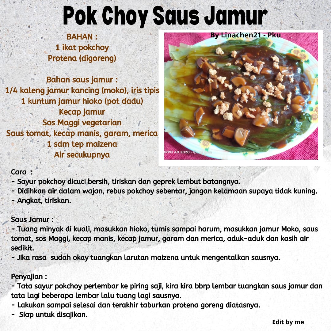 – Tata sayur pokchoy perlembar ke piring saji, kira kira bbrp lembar tuangkan saus jamur dan