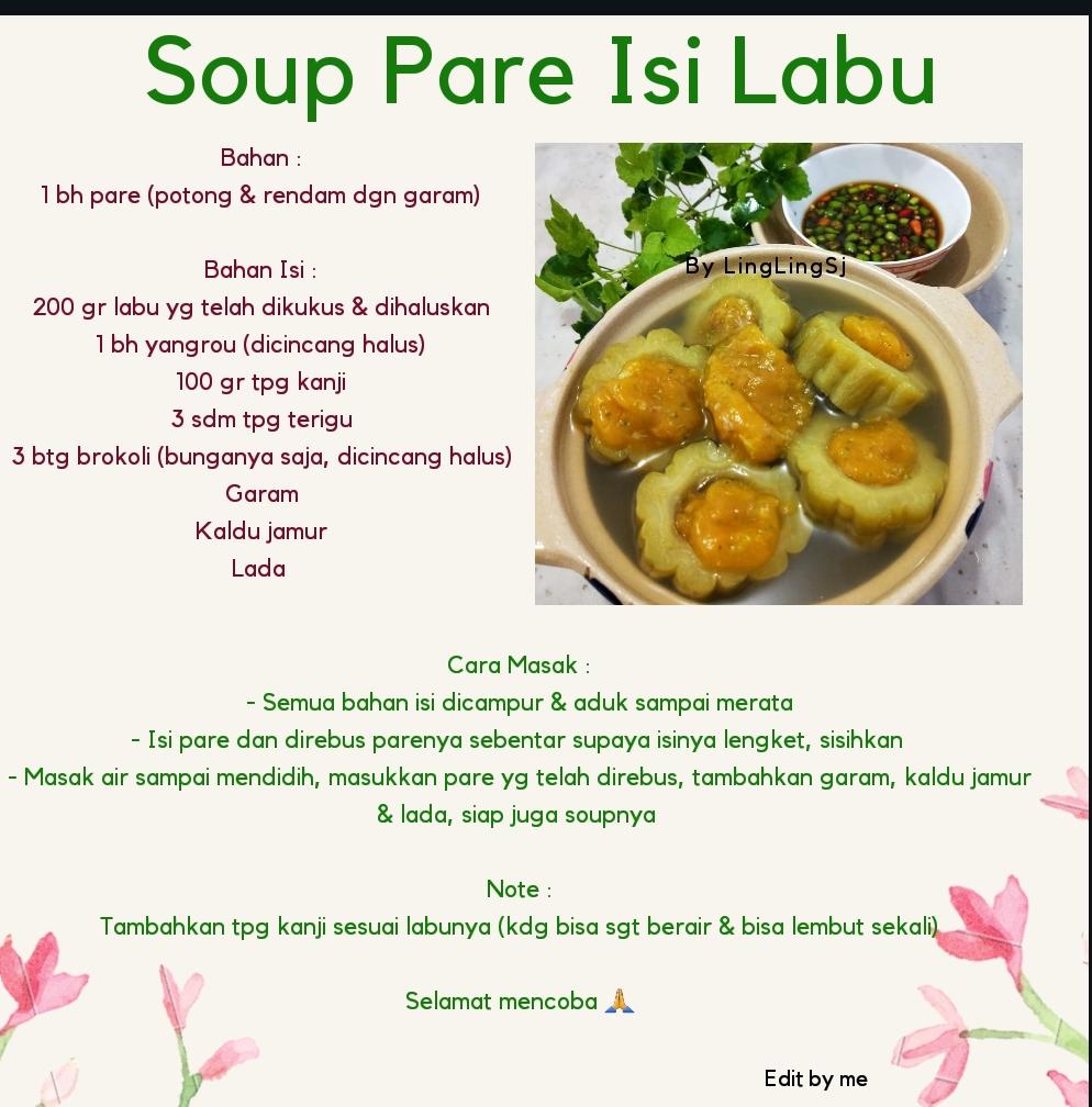 – Masak air sampai mendidih, masukkan pare yg telah direbus, tambahkan garam, kaldu jamur