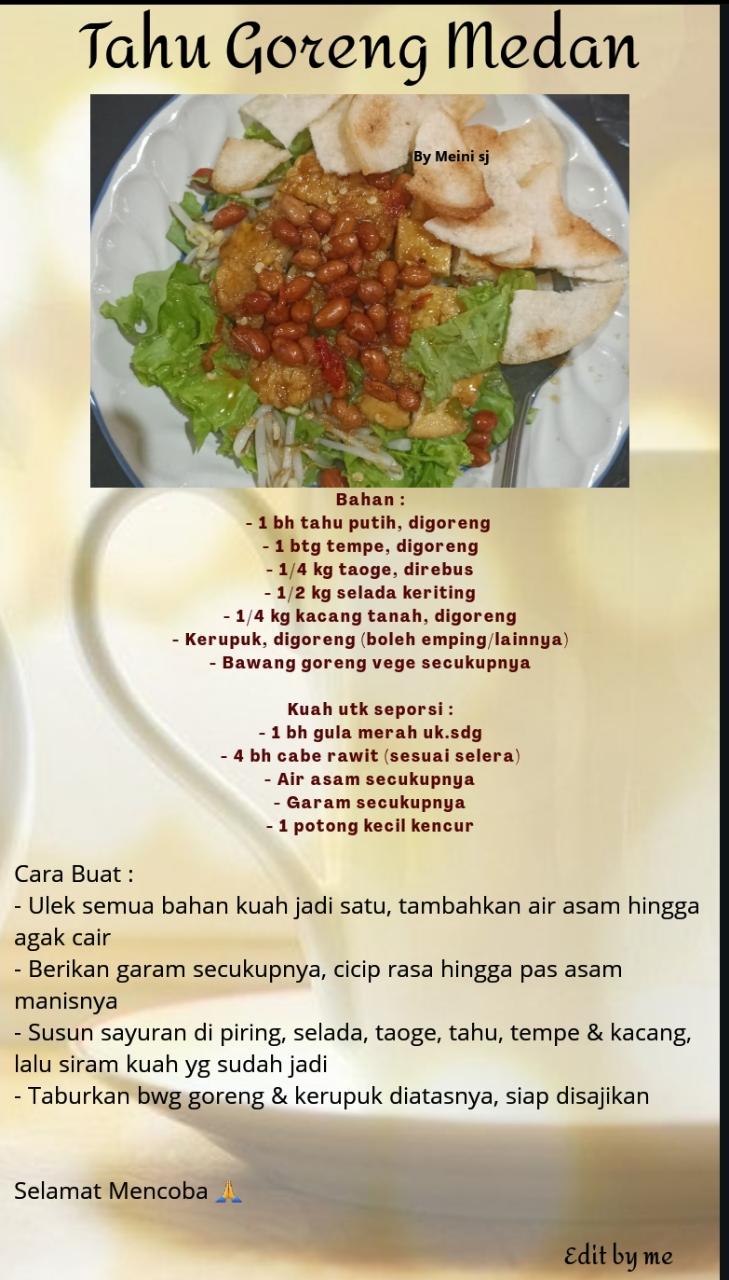 – Susun sayuran di piring, selada, taoge, tahu, tempe & kacang, lalu siram kuah yg sudah jadi