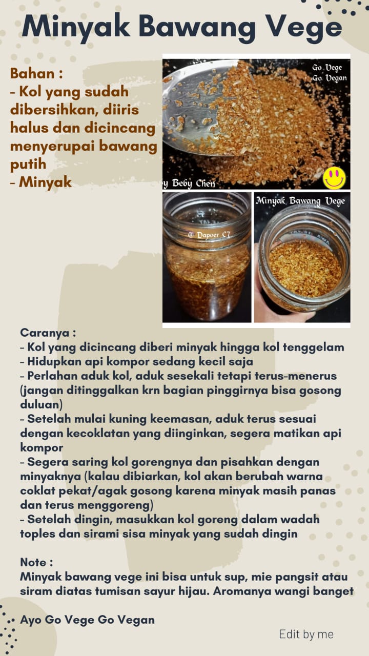 Minyak bawang vege ini bisa untuk sup, mie pangsit atau siram diatas tumisan sayur hijau. Aromanya wangi banget